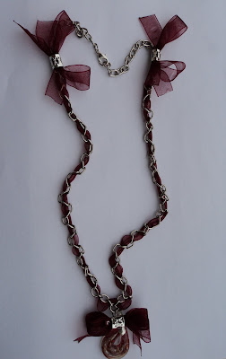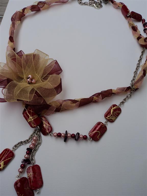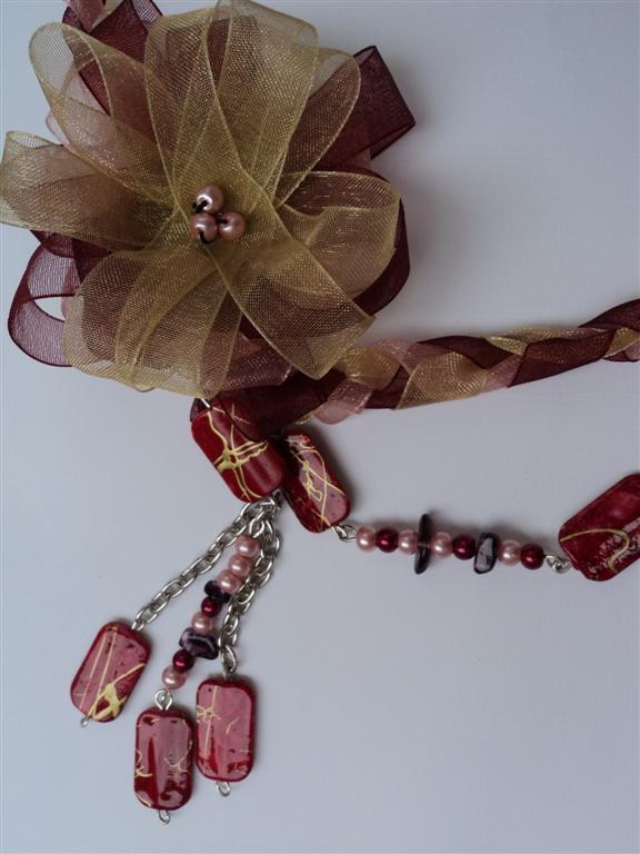 COLIERUL CONTINE PANGLICI ORGANZA IMPLETITE,PERLE DE STICLA,MARGELE PLATE DE PLASTIC SI LANT METALIC.