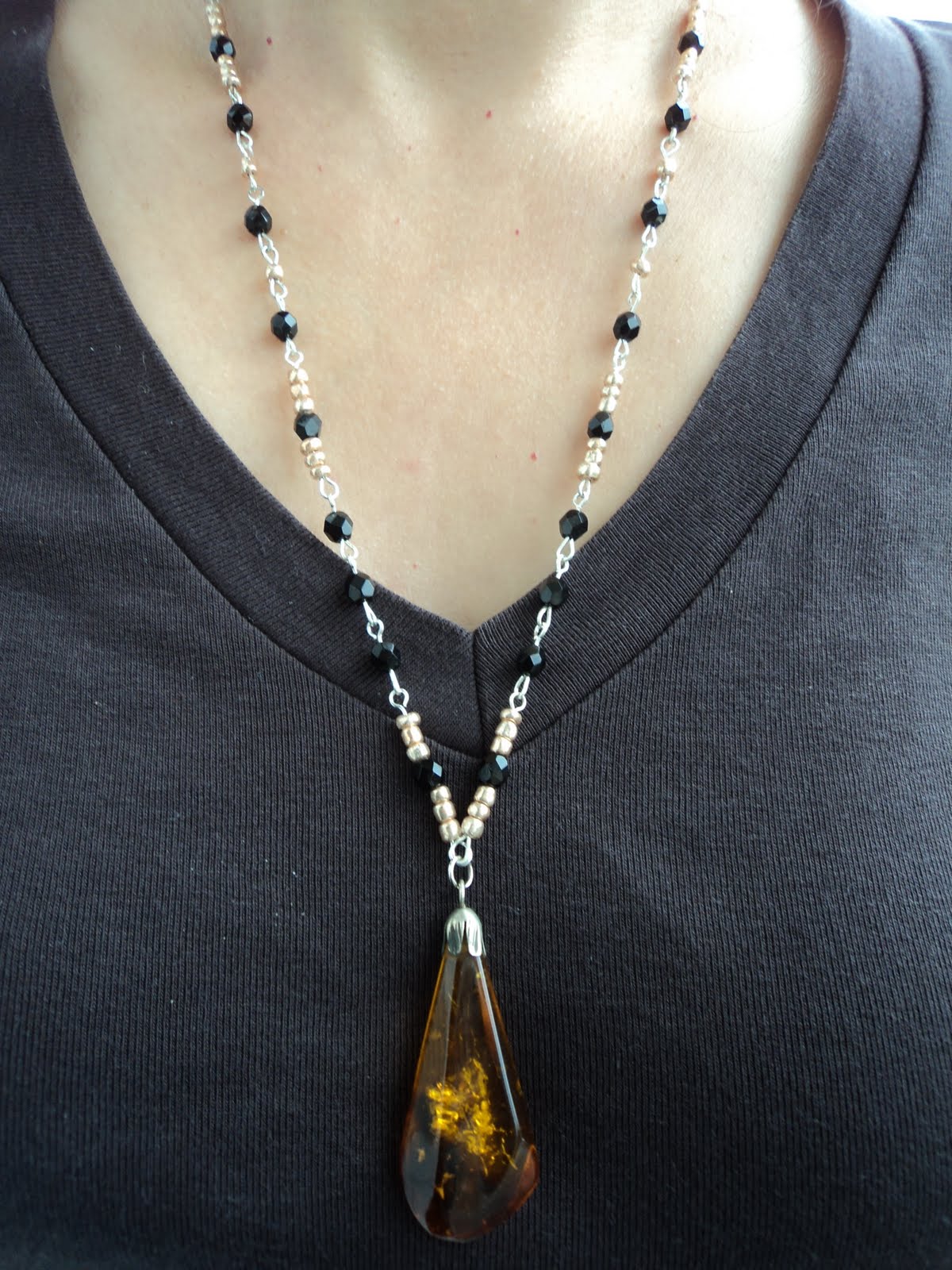 SETUL CONTINE COLIER DIN CRISTALE NEGRE , MARGELE NISIP SOMON, PRECUM SI UN PANDANTIV DEOSEBIT DIN CHIHLIMBAR SI O PERECHE DE CERCEI.