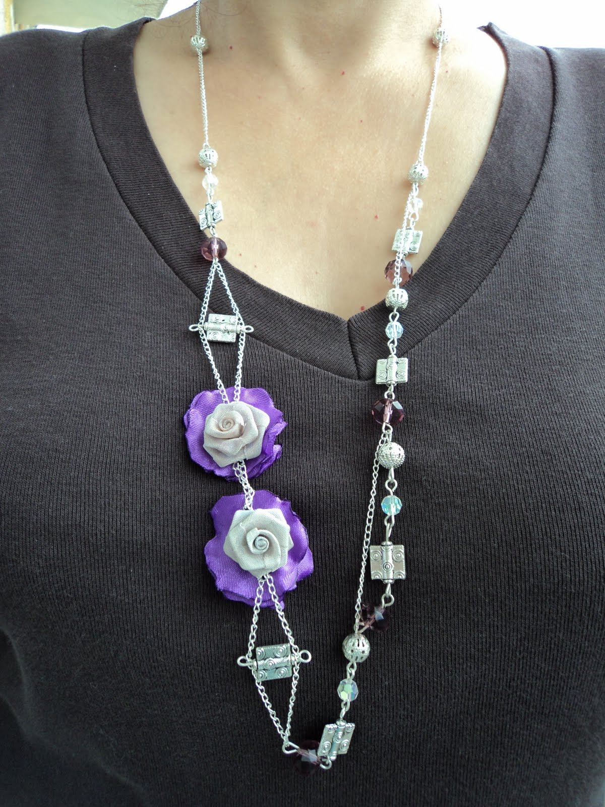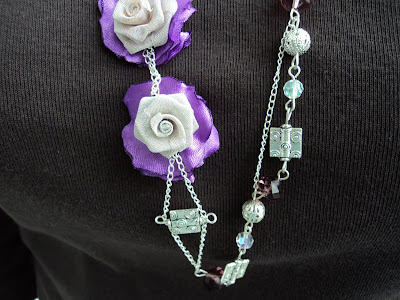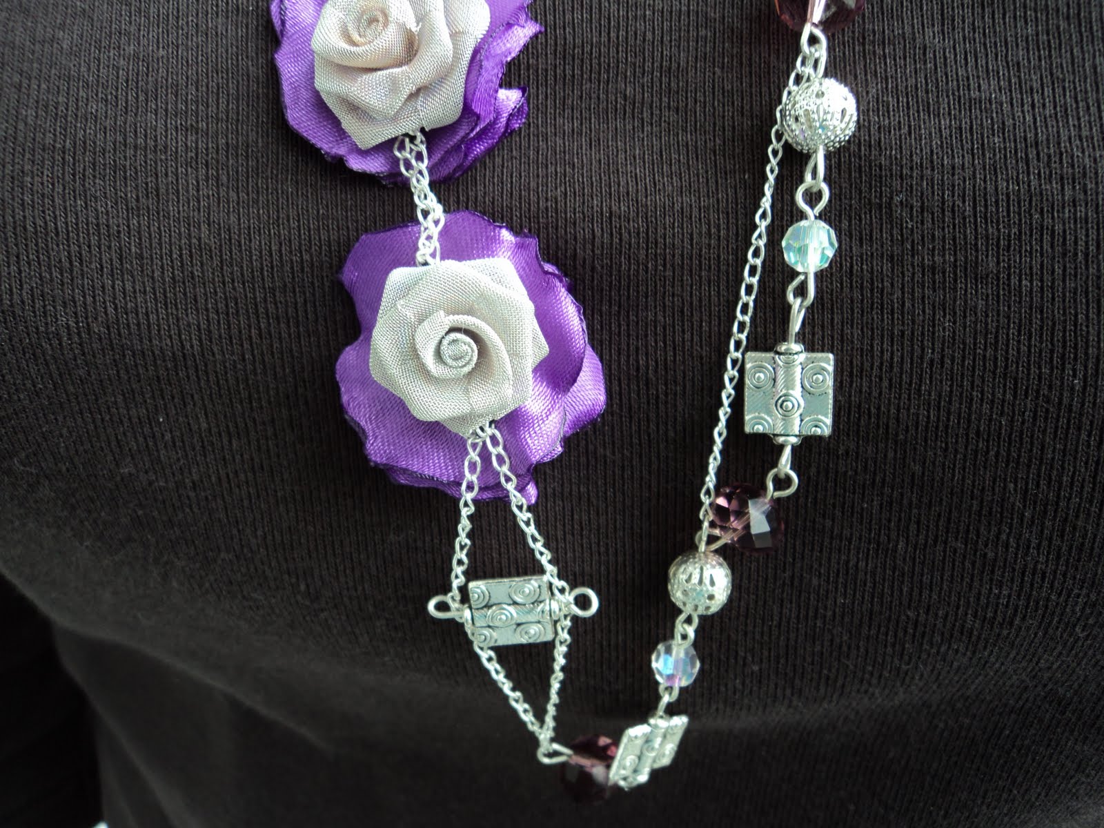 SETUL CONTINE UN COLIER DIN LANT METALIC ARGINTIU,MARGELE METALICE FILIGRAN,CRISTALE VIOLET SI AB,PRECUM SI 2 TRANDAFIRI METALICI+TEXTILI, SI O PERCHE DE CERCEI.