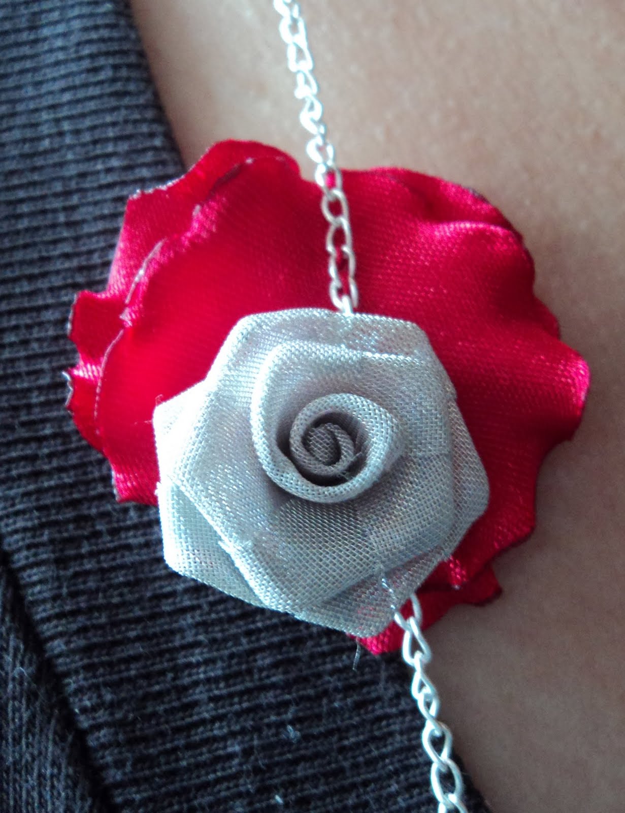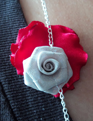 SETUL CONTINE UN COLIER DIN LANT METALIC ARGINTIU,PERLE DE STICLA SI CRISTALE ROSII S,PRECUM SI UN TRANDAFIR METALIC+TEXTIL, SI O PERECHE DE CERCEI ASORTATI. COLIERUL ESTE ASIMETRIC.