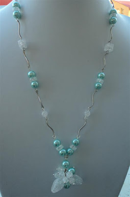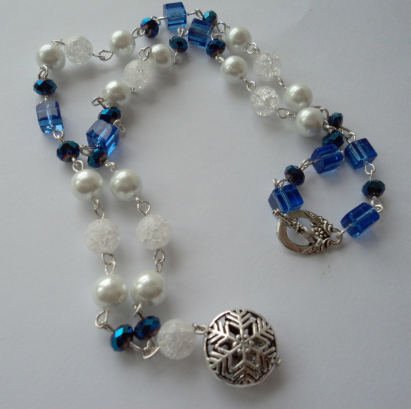 Bratara este realizata din lant metalic argintiu,pandantive metalice(om de zapada,ingeras,fulgi de zapada)si diferite margele metalice si din sticla,chipsuri de turcoaz si sticla.