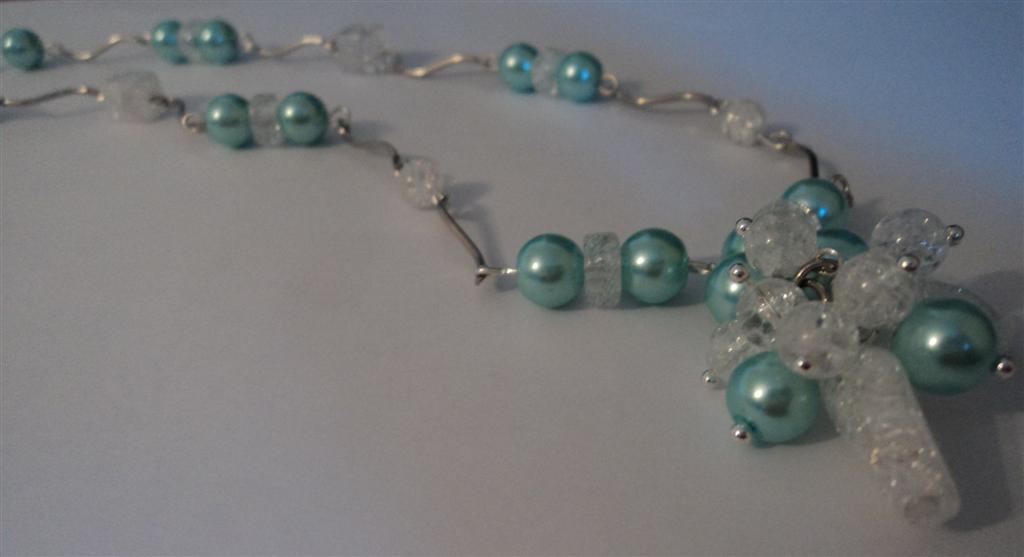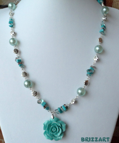 Setul este format din colier si cercei si contine trandafiri turcoaz din rasina,margele metalice,margele sticla bleo,chipsuri de turcoaz si sticla.