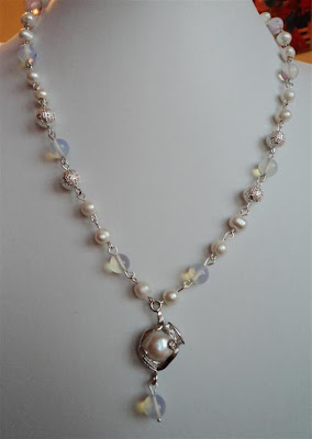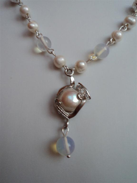 COLIERUL CONTINE PERLE NATURALE,MARGELE DE OPAL, MARGELE METALICE FILIGRAN SI UN PANDANTIV CU PERLA NATURALA.