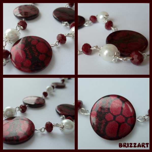 Setul este format din colier,bratara si cercei si contine perle plate de sidef,cristale mate bordo si perle de sticla albe.
