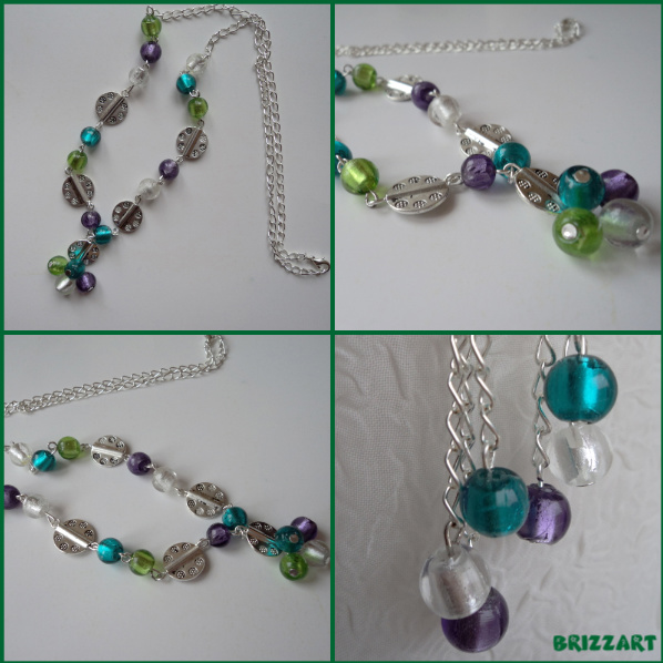 SETUL CONTINE COLIER SI CERCEI CU MARGELE DIN STICLA CU FOITA ARGINTIE,MARGELE DECORATIVE METALICE SI LANT METALIC ARGINTIU.