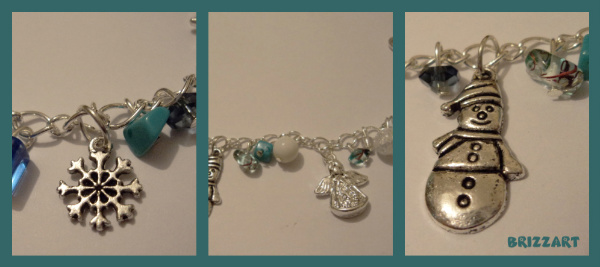 Bratara este realizata din lant metalic argintiu,pandantive metalice(om de zapada,ingeras,fulgi de zapada)si diferite margele metalice si din sticla,chipsuri de turcoaz si sticla.